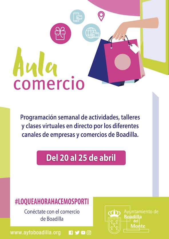Los establecimientos y el Ayuntamiento de Boadilla del Monte se han unido para ofrecer algo que hacer cada día a sus vecinos durante el confinamiento. “LOQUEAHORAHACEMOSPORTÍ" es el lema de Aula Comercio, una agenda semanal que incluye actividades, talleres y clases virtuales en directo, a través de los diferentes canales de empresas y comercios de la localidad.