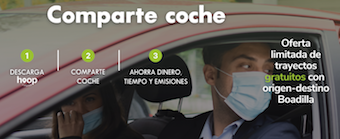 Boadilla del Monte se une al coche compartido. El Ayuntamiento ha puesto en marcha el proyecto #BoadillaComparteCoche, junto con la aplicación móvil Hoop Carpool, para que los vecinos y visitantes puedan compartir coche para ir al trabajo o para cualquiera de sus desplazamientos.